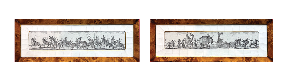 Pair of 9.5x26"classical-style engravings mounted with gold-accented bevel mats and encased in a custom burl wood-style frames and glass.